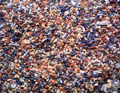 Like snowflakes, each bead is different. I have used 6 different kinds of colored clay and at least 100 texturizing objects: clay tools, furniture, soles of shoes, found and scrounged objects, and fire them at differing degrees and times to bring out the varying colors in each clay. I.e sandstone buff changes from a light yellow to orange, to tan depending on the temperature. The goal of this project is to demonstrate that clay itself is beautiful and needs no glaze as enhancement and, as always, to minimize my carbon footprint by not using glazes and keeping the firing time and temp as low as possible.