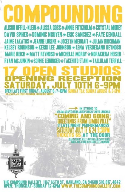 I joined the studio because I found myself becoming a shut-in; only leaving the apartment to buy alcohol and food....mostly alcohol. I moved to Oakland to immerse myself in the art culture of the Bay Area yet found myself immersed in my own work, rarely venturing out to explore the work of others. When the Compound expanded I took the opportunity to join a group of young, savvy, educated artists primarily to get out of my head but also to get into the art world. I love the studios, gallery space, fellow artists and especially Matt and Lena who work non-stop to develop their/our space where we can work, meet, talk, eat, drink....and play beanbag toss. My space at the Compound has become more of a display space, where I can hang my work, since when I finish a piece I want it to go away, but not too far, so I can tweak and live with it to learn its flaws and find out where it/I need to go next with it. The factory is still in-home where I can work whenever and in whatever I please but the Compound is the best place for hanging (semi-private) to receive an educated critique, feedback and direction as well as a cool vibe to work in.