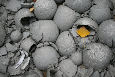 This project was originally designed for a class assignment on 'containers'. Each clay ball is hollow, inserted with a little piece of paper in each one with "storage" written in differing fonts - storage being one purpose for a container but obviously difficult to store anything in a sealed clay ball. My intention was to not fire the balls and leave them outside in an urn to break down with the weather, a project I had to write a proposal for since it was on campus property and get a written approval. I photographed the balls almost every day noting their change - it took 2 months for any major change, other than people shuffling the composition and breaking a few, but it finally rained and the clay weakened sufficiently to crack the balls. I might be one of the few artists who was disappointed to see her art not falling apart and considered helping nature along by dumping a bucket of water on it.