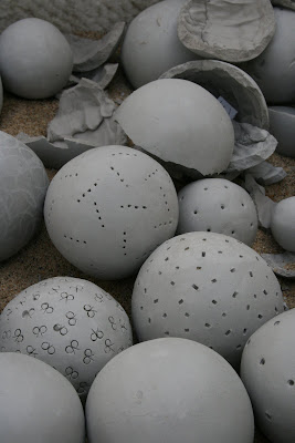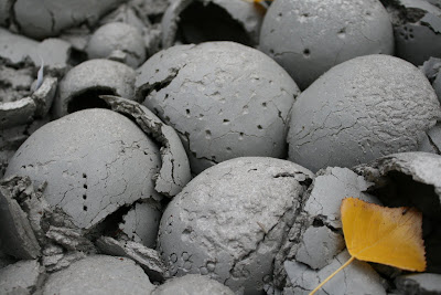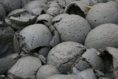 This project was originally designed for a class assignment on 'containers'. Each clay ball is hollow, inserted with a little piece of paper in each one with "storage" written in differing fonts - storage being one purpose for a container but obviously difficult to store anything in a sealed clay ball. My intention was to not fire the balls and leave them outside in an urn to break down with the weather, a project I had to write a proposal for since it was on campus property and get a written approval. I photographed the balls almost every day noting their change - it took 2 months for any major change, other than people shuffling the composition and breaking a few, but it finally rained and the clay weakened sufficiently to crack the balls. I might be one of the few artists who was disappointed to see her art not falling apart and considered helping nature along by dumping a bucket of water on it.