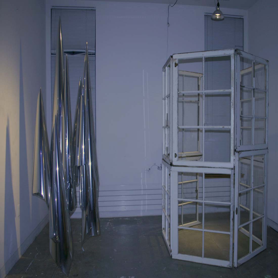The project was for an installation of the space my body fills.The original plan was to create the room of old windows and cover the windows with reflective film so people could walk around, see their reflection and faintly see someone on the other side of the glass making the viewer curious to go around and inside.